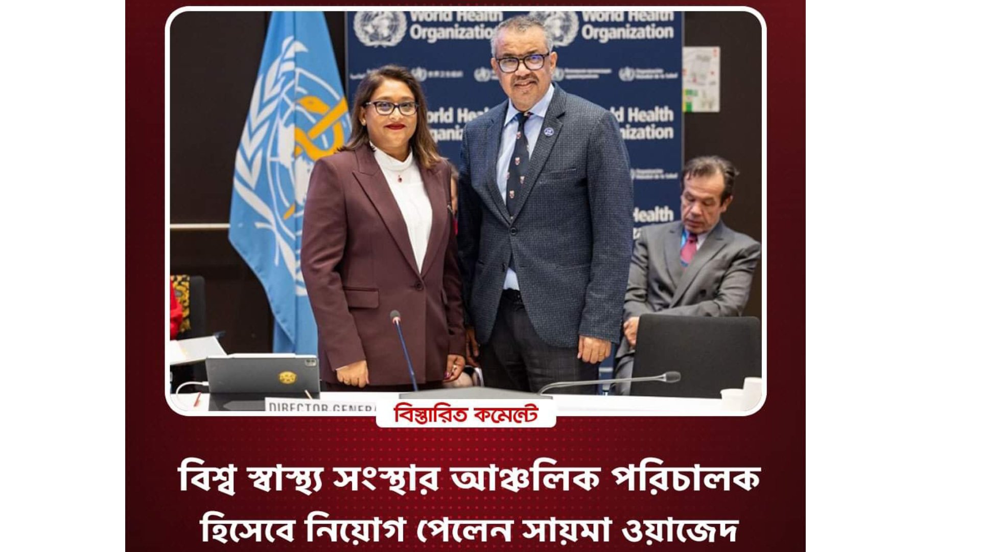 উল্লেখ্য, গত বছর পহেলা নভেম্বর ভারতের নয়া দিল্লিতে বিশ্ব স্বাস্থ্য সংস্থার আঞ্চলিক কমিটির ৭৬তম অধিবেশনে সংস্থাটির আঞ্চলিক পরিচালক হিসেবে নির্বাচিত হন সায়মা ওয়াজেদ।