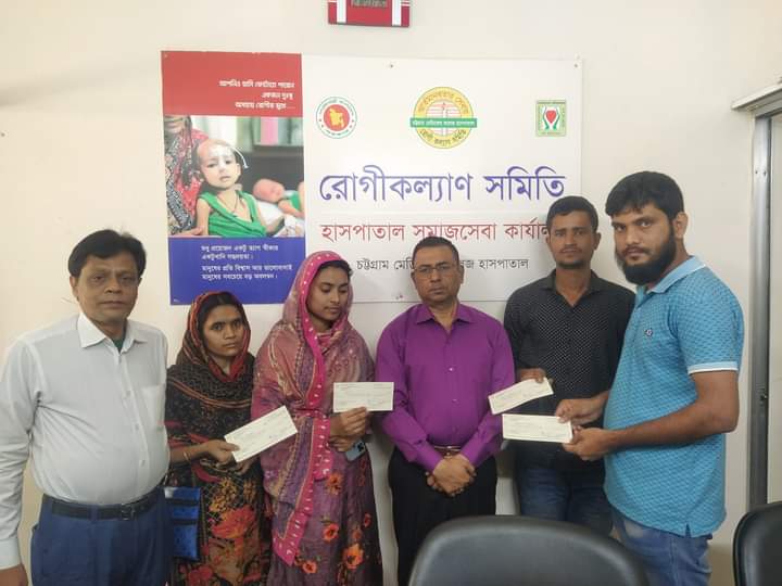 জুলেখা আক্তার আঁখি(৭),ফতোয়াবাদ,নিহা(১০)-আনোয়ারা, সুমাইয়া আক্তার ফারহানা(৭)-চান্দগাঁও, বানু আক্তার, (২৫)-কাপ্তাই রাস্তার মাথা, চট্টগ্রামের অগ্নি দগ্ধ পোড়া রোগীর জন্য তাদের স্বজনদের নিকট চিকিৎসা সহায়তায় ১৫,০০০টাকা করে মোট ৬০,০০০টাকার চেক প্রদান করা হয়।