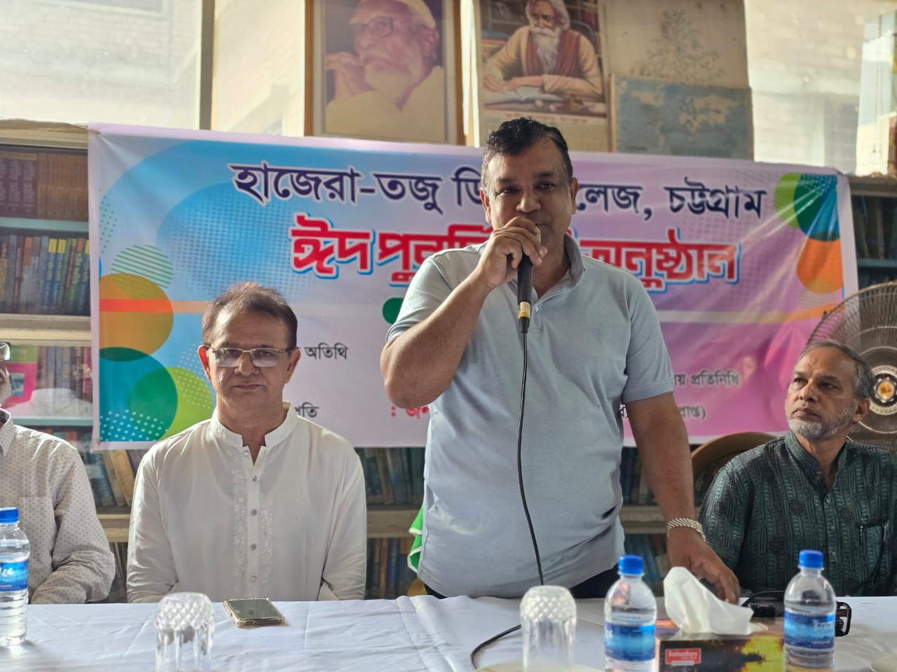 হাজেরা-তজু ডিগ্রি কলেজে ঈদ পুনর্মিলনী অনুষ্ঠান অত্যন্ত আনন্দময় পরিবেশে অনুষ্ঠিত হয়। গত বুধবার অধ্যক্ষ এস.এম. আইয়ুবের সভাপতিত্বে অনুষ্ঠিত সভায় অনুষ্ঠানে প্রধান অতিথি হিসেবে উপস্থিত ছিলেন গভর্নিং বডির জাতীয় বিশ্ববিদ্যালয় প্রতিনিধি আলহাজ মুজিবুর রহমান। শিক্ষক-কর্মচারীবৃন্দসহ অন্যদের মধ্যে উপস্থিত ছিলেন গভর্নিং বডির সম্মানিত সদস্য মোহাম্মদ জাহাঙ্গীর আলম, মোহাম্মদ আনিসুর রহমান, মফিজুর রহমান, মাহাবুবুল আলম, কলেজের প্রাক্তন অধ্যক্ষ মোহাং দবির উদ্দীন খান, অধ্যক্ষ এ.কে. এম. ইছামাইল, অধ্যক্ষ মোহাঃ কুতুব উদ্দীন ও শিক্ষক প্রতিনিধিবৃন্দ। প্রধান অতিথি তার বক্তব্যে ঈদের শুভেচ্ছা জানিয়ে বলেন, একটি শিক্ষাপ্রতিষ্ঠান ও শিক্ষার মানোন্নয়নের মূল কারিগর হলেন সম্মানিত শিক্ষকবৃন্দ। কলেজের দলীয় রাজনীতিমুক্ত সুন্দর-সুশৃঙ্খল পরিবেশকে ধরে রাখার জন্য শিক্ষক-কর্মচারীবৃন্দের সময়ানুবর্তিতা এবং ক্যাম্পাসে নির্ধারিত সময় পর্যন্ত উপস্থিতির আবশ্যকতার ওপর তিনি গুরুত্ব আরোপ করেন।