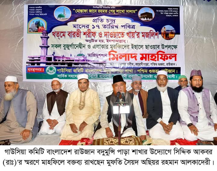 রাউজানে গাউসিয়া কমিট বাংলাদেশ এর পশ্চিম গুজরা বদুমুন্সি পাড়া শাখার উদ্যোগে, ইসলামের প্রথম খলিফা হযরত আবু বকর সিদ্দিক (রাদিয়াল্লাহু তায়ালা আনহুর) ওফাত বাার্ষিকী স্বরণে এক আলোচনা সভা, মিলাদ মাহফিল, মীর মুহাম্মদ আবু জাহেদের সভাপতিত্বে ২০ ডিসেম্বর স্থানিয় খানকাহ শরীফে অনুষ্ঠিত হয়।