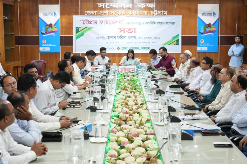 চট্টগ্রাম জেলা প্রশাসকের কার্যালয়ের সম্মেলন কক্ষে জেলা প্রশাসক ও জেলা নির্বাহী ম্যাজিস্ট্রেট ফরিদা খানম এর সভাপতিত্বে ‘চট্টগ্রাম ফাউন্ডেশন’ এর গঠনতন্ত্র, কার্যবিধি প্রণয়ন সংক্রান্ত সভা গতকাল মঙ্গলবার দুপুরে অনুষ্ঠিত হয়েছে।