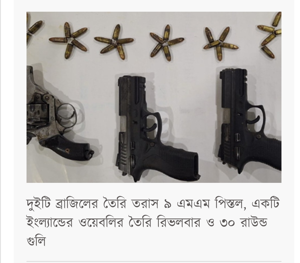 বিষয়টি নিশ্চিত করেছেন মহানগর গোয়েন্দা পুলিশের পরিদর্শক মোহাম্মদ ইসরাফিল মজুমদার। তিনি জানান, গোপন সংবাদের ভিত্তিতে বাকলিয়া থানা এলাকায় একটি ময়লার স্তূপ থেকে ব্রাজিলের তৈরি তরাস ৯ এমএম সচল পিস্তল, একটি ইংল্যান্ডের ওয়েবলির তৈরি রিভলবার এবং ৩০ রাউন্ড গুলি উদ্ধার করা হয়। তবে এসময় কাউকে গ্রেপ্তার করা যায়নি। এই ব্যাপারে পরবর্তী আইনগত ব্যবস্থা প্রক্রিয়াধীন।