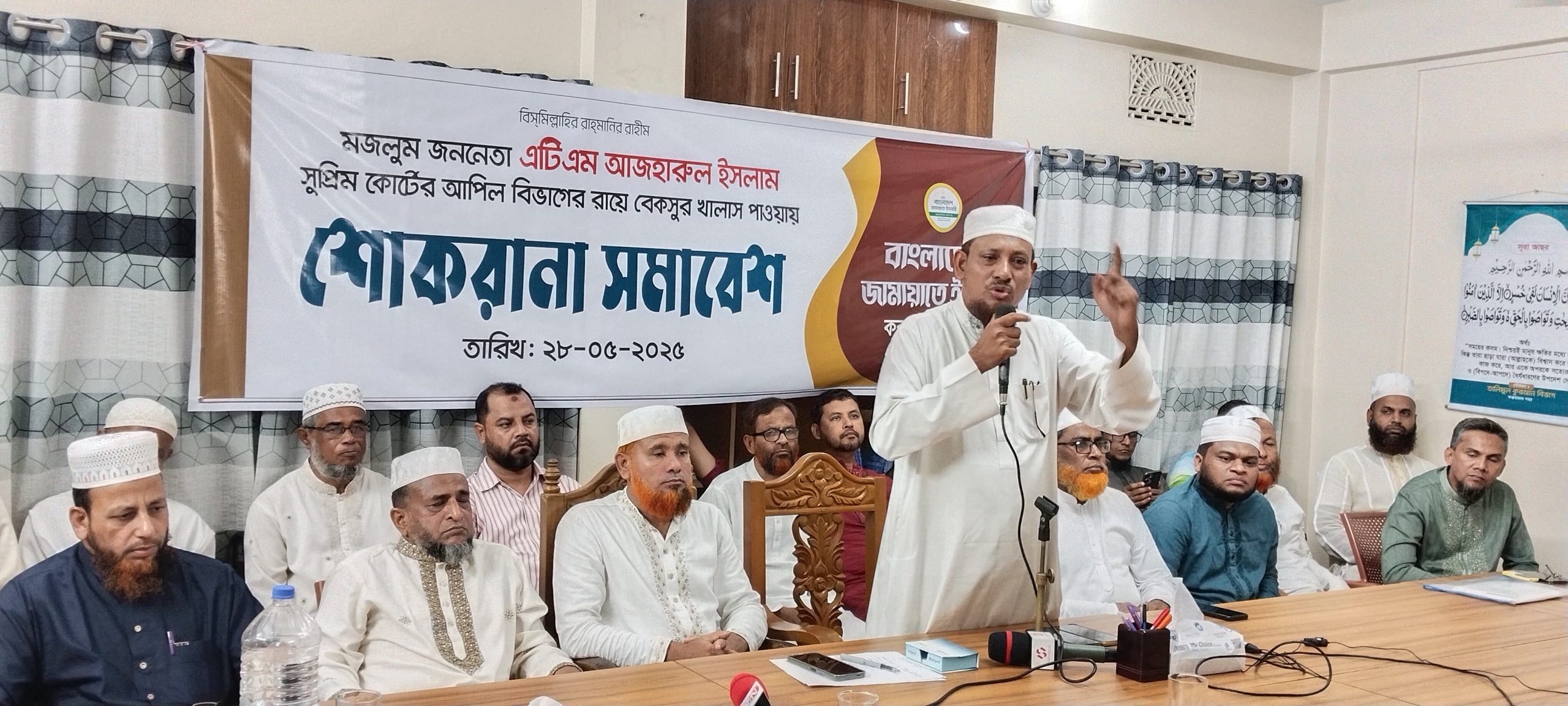 জামায়াতে ইসলামীর সাবেক ভারপ্রাপ্ত সেক্রেটারি জেনারেল জননেতা এটিএম আজহারুল ইসলাম আপিল বিভাগ কর্তৃক বেকসুর খালাস পেয়ে মুক্তি পাওয়ায় কেন্দ্র ঘোষিত কর্মসূচির অংশ হিসেবে এক শোকরানা সমাবেশ ২৮ মে সন্ধ্যায় জেলা জামায়াতের উদ্যোগে অনুষ্ঠিত হয়। সমাবেশে সভাপতির বক্তব্যে জেলা আমীর অধ্যক্ষ মাওলানা নূর আহমদ আনোয়ারী বলেছেন, মহান আল্লাহর একান্ত ইচ্ছায় ইসলাম বিরোধী সকল ষড়যন্ত্র ছিন্ন করে নিরপরাধ মানুষ হিসেবে সুপ্রিম কোর্টের আপিল বিভাগের রায়ে বেকসুর খালাস পেয়েছেন এটিএম আজহারুল ইসলাম। ফ্যাসিস্ট আ’লীগ জামায়াতে ইসলামীকে আদর্শিকভাবে মোকাবেলায় ব্যর্থ হয়ে নেতৃবৃন্দ কে হত্যার মিশনে নেমেছিল। এটিএম আজহারুল ইসলামের রায়ের মাধ্যমে প্রমাণিত হয়েছে ন্যায় ভ্রষ্ট রায়ের মাধ্যমে যাদের কে ফাঁসি দিয়েছে তারা সকলেই ছিল নির্দোষ ও নিরপরাধ। শুধুমাত্র রাজনৈতিক প্রতিহিংসার বশবর্তী হয়ে আ’লীগ আমাদের নেতৃবৃন্দ কে হত্যা করেছে। আমরা দেশবাসীর কাছে জামায়াত নেতৃবৃন্দের প্রতি আ’লীগের অবিচার ও জুলুমের বিচার তুলে দিলাম। তিনি আরো বলেন, জুলাই আন্দোলনের মাধ্যমে বাংলাদেশ এক নতুন মোহনায় উপনীত হয়েছে। দেশ ও ইসলাম বিরোধী শক্তি এখনো বাংলাদেশকে পথহারা করার ষড়যন্ত্র চালিয়ে যাচ্ছে। তিনি সকল নেতাকর্মীকে শাহাদাতের চেতনায় উজ্জীবিত হয়ে দেশের স্বাধীনতা -সার্বভৌমত্ব ও ইসলামী তাহজীব -তামাদ্দুন রক্ষায় এগিয়ে আসার আহ্বান জানান।