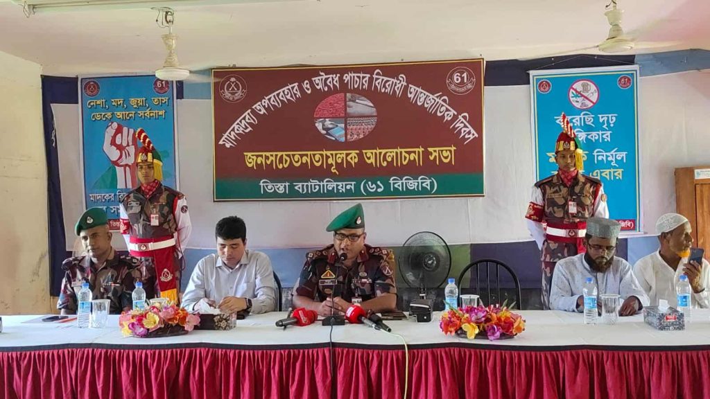 বৃহস্পতিবার দুপুরে তিস্তা- ৬১ ব্যাটালিয়ন বিজিবি’র আয়োজনে মাদকদ্রব্যের অপব্যবহার ও অবৈধ পাচার বিরোধী আন্তর্জাতিক দিবস উপলক্ষ্যে লালমনিরহাটের হাতীবান্ধা উপজেলার সানিয়াজান এলাকার নিজ শেখ সুন্দর দাখিল মাদ্রাসায় জনসচেতনতামূলক সভায় এই মন্তব্য করেন তিনি।