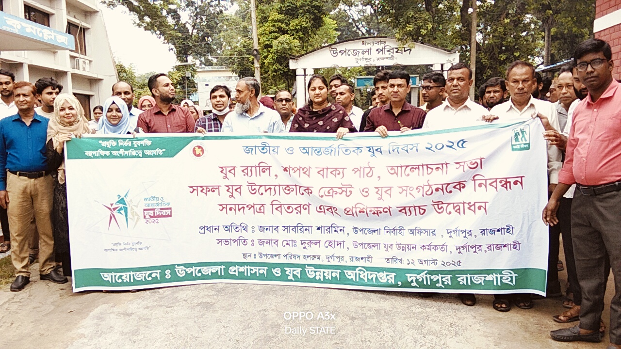 রাজশাহীর দুর্গাপুরে “প্রযুক্তি নির্ভর যুবশক্তি বহু পাক্ষিক অংশীদারিত্বে অগ্রগতি” এই প্রতিপাদ্যকে সামনে রেখে সারা দেশের ন্যায় নানা আয়োজনে জাতীয় ও আন্তর্জাতিক যুব দিবস ২০২৫ পালিত হয়েছে।