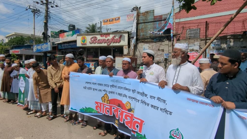 শেরশাহ বাংলাবাজার মোড়ে দূর্ঘটনা প্রতিরোধ ফুটওভার ব্রিজ,যাত্রী ছাউনি স্থাপন,ট্রাফিক পুলিশ বক্স স্থাপন, গতি প্রতিরোধক স্থাপন,এবং ভ্রাম্যমাণ দোকান অপসারণের দাবিতে বাংলাদেশ জামায়াতে ইসলামী ২নং জালালাবাদ ওয়ার্ডের উদ্যেগে মানববন্ধন কর্মসূচি পালিত হয়।