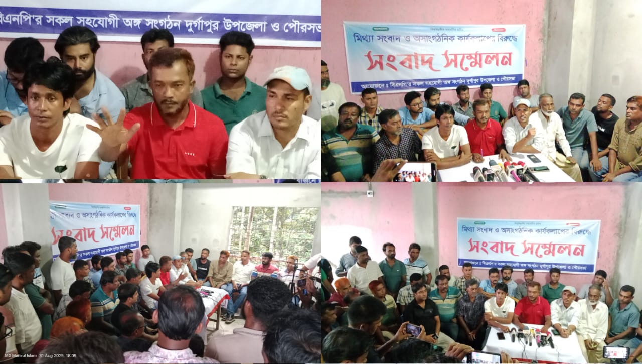 রাজশাহী দুর্গাপুরে মিথ্যা সংবাদ ও অসাংগঠনিক কার্যকলাপের বিরুদ্ধে উপজেলা ও পৌর বিএনপির সকল অঙ্গ সহযোগী সংগঠনের নেতারা একটি সংবাদ সম্মেলন করেছেন, সংবাদ সম্মেলনে দুর্গাপুর পৌর শ্রমিক দলের আহ্বায়ক আবুল কালামের সভাপতিত্বে, রবিবার (৩১ আগস্ট) বিকেল সাড়ে ৫ টার সময় দুর্গাপুর প্রেসক্লাব ও সাংবাদিক সমাজের ভবনে এ সংবাদ সম্মেলনের আয়োজন করে দুর্গাপুর উপজেলা ও পৌর বিএনপির সকল অঙ্গ সহযোগী সংগঠন।