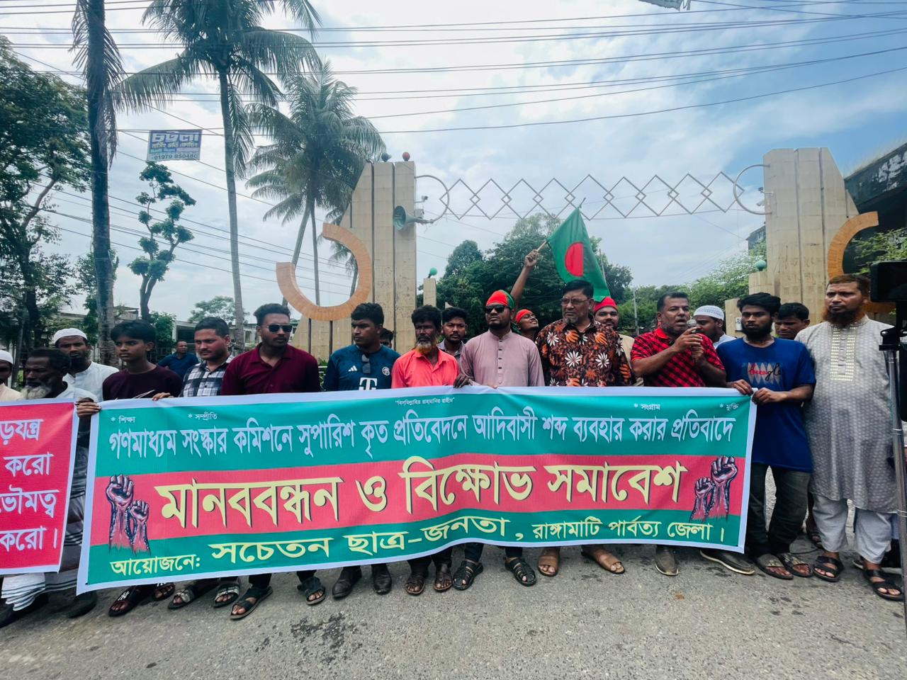 অন্তর্বর্তীকালীন সরকারের গণমাধ্যম সংস্কার কমিশনের সুপারিশ কৃত প্রতিবেদনে বিতর্কিত আদিবাসী শব্দের ব্যবহারের প্রতিবাদ, উক্ত প্রতিবেদন থেকে আদিবাসী শব্দ বাতিলের দাবিতে মানববন্ধন ও বিক্ষোভ সমাবেশ করেছে রাঙ্গামাটি জেলা সচেতন ছাত্র- জনতা।বুধবার (১০ সেপ্টম্বর) সাড়ে ১০টায় রাঙ্গামাটি পৌরসভা প্রাঙ্গণে রাঙ্গামাটি পার্বত্য জেলার সচেতন ছাত্র-জনতার উদ্যােগে মানববন্ধন ও বিক্ষোভ সমাবেশ অনুষ্ঠিত হয়।