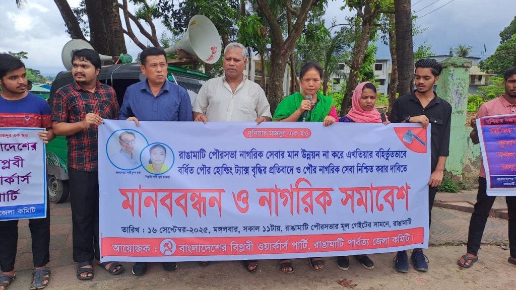 রাঙ্গামাটি পার্বত্য জেলা পৌরসভা নাগরিক সেবার মান উন্নয়ন না করে এখতিয়ার বহির্ভুতভাবে বর্ধিত পৌর হোল্ডিং ট্যাক্স বৃদ্ধির প্রতিবাদ, পৌর নাগরিক সেবা নিশ্চিত করার দাবিতে বাংলাদেশের বিপ্লবী ওয়ার্কার্স পার্টি রাঙ্গামাটি পার্বত্য জেলা কমিটির আয়োজনে মানববন্ধন ও নাগরিক সমাবেশ অনুষ্ঠিত হয়েছে।