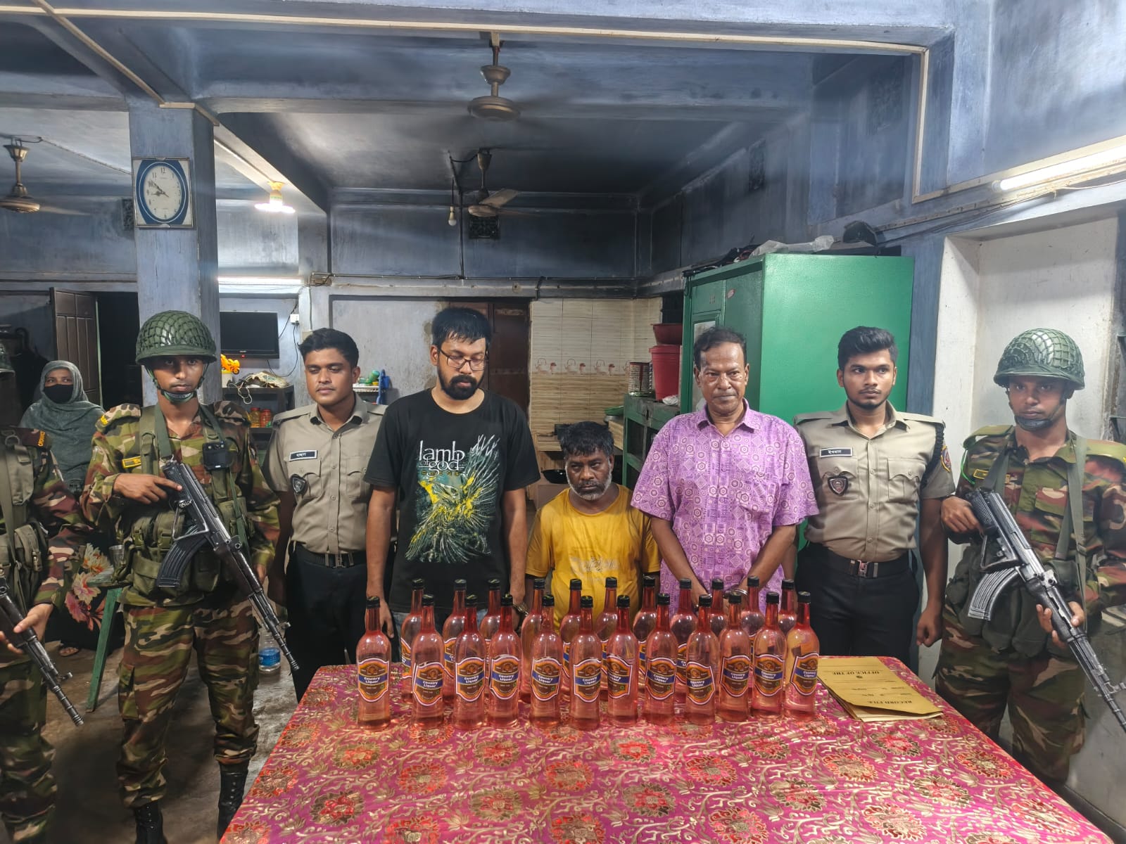 আটককৃতরা হলেন লক্ষ্মীপুর পৌরসভা ৫ নং ওয়ার্ড বাঞ্ছানগরের মৃত রাধা বল্লভ সাহার ছেলে কিশোর কুমার সাহা (৬২), মৃত অনিল চন্দ্র বাছারের ছেলে শ্রীধাম চন্দ্র বাসার(৪৩), কিশোর কুমার সাহার ছেলে জয় শাহা (৩০)।এর আগে যৌথ বাহিনী তাদের মালিকানাধীন জয় ফার্মেসি ও তার পেছনের বাসায় অভিযান চালায়, এসময় তল্লাশি চালিয়ে বাসার ভেতর গোডাউন থেকে মদ উদ্ধার করা হয়।লক্ষ্মীপুর মাদকদ্রব্য নিয়ন্ত্রণ অধিদপ্তরের সহকারী পরিচালক মোহাম্মদ শরীফ উদ্দিন বলেন, লক্ষ্মীপুর সেনা ক্যাম্প কমান্ডার ক্যাপ্টেন রাহাত খানের নেতৃত্বে এ অভিযান পরিচালনা করা হয়। এসময় তাদেরকে কাছ থেকে ২৩ লিটার মদ উদ্ধার করা হয়। তাদের বিরুদ্ধে পরবর্তী আইনি প্রক্রিয়া গ্রহন করা হবে।
