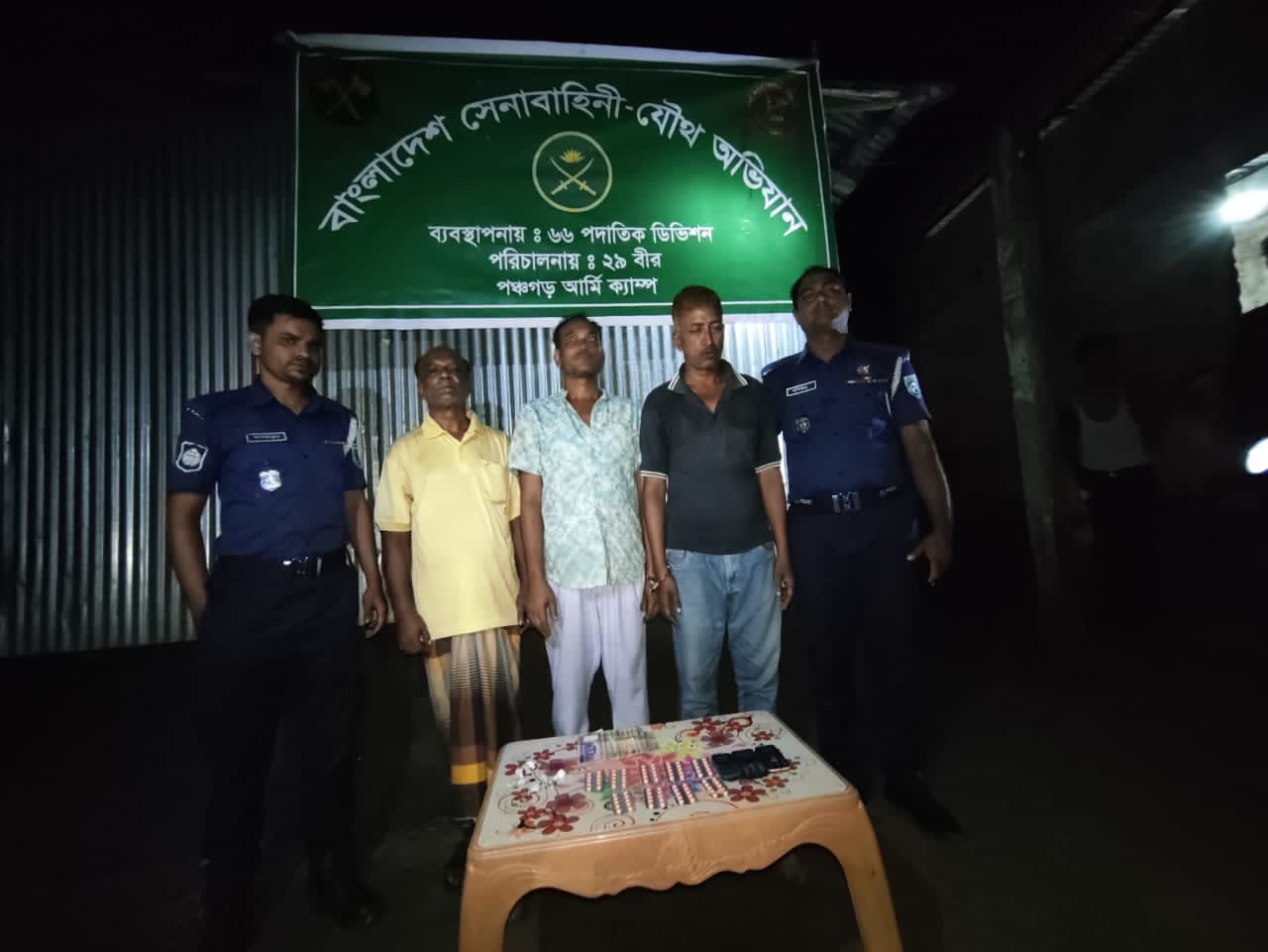 জানা যায়,পঞ্চগড় সদর উপজেলার কামাত কাজলদিঘী ইউনিয়নের ঘটবর এলাকায় মাদকের বেচাকেনা চলছে। এমন সংবাদের ভিত্তিতে বাংলাদেশ সেনাবাহিনীর রংপুর ৬৬ পদাতিক ডিভিশনের ২২২ পদাতিক ব্রিগেডের সৈয়দপুর সেনানিবাসের ২৯ বীর ব্যাটালিয়নের লেফটেন্যান্ট ফরহাদ অর রশিদের নেতৃত্বে পঞ্চগড় সেনা ক্যাম্পের সদস্যরা ওই এলাকায় অভিযান পরিচালনা করে। এসময় ৯০ পিছ ট্যাপেন্টাডল ও ৭ পুরিয়া গাঁজা সহ বিএনপি নেতা জাহাঙ্গীর, মাদক ব্যবসায়ী নবিরুল ও কাইয়ূমকে আটক করে সেনাবাহিনীর সদস্যরা।অভিযানে সদর থানা পুলিশের একটি দল উপস্থিত ছিলেন।