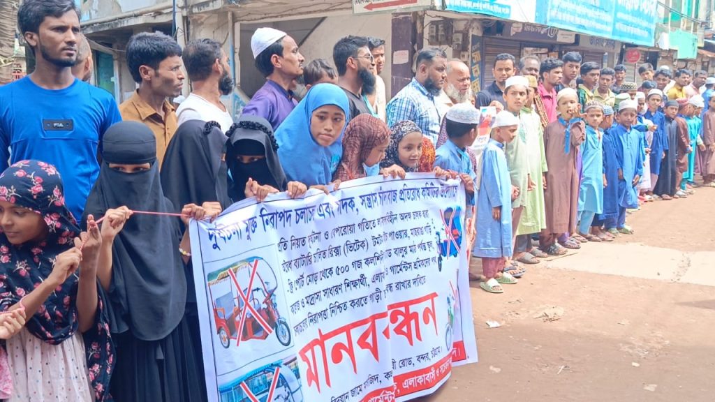 দুর্ঘটনায় এড়াতে ফ্রি পোর্ট মোড় থেকে কলশীদীঘি রোড বালুর মাঠ পর্যন্ত ব্যাটারীচালিত রিকশা ও অবৈধ গাড়ি চলাচল বন্ধের দাবিতে শিক্ষার্থীদের মানববন্ধন।
