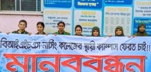 স্থায়ী ক্যাম্পাস ফিরিয়ে দেওয়া এবং শিক্ষার স্বাভাবিক পরিবেশ নিশ্চিত করার দাবিতে মানববন্ধন করেছেন বাংলাদেশ ইনস্টিটিউট অব হেলথ সায়েন্সেস (বিআইএইচএস) নার্সিং কলেজের শিক্ষার্থীরা। প্রায় তিন মাস