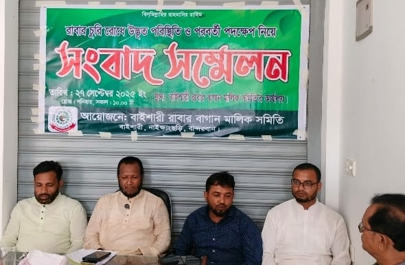 বান্দরবানের নাইক্ষ্যংছড়ি উপজেলার বাইশারীতে ক্রমবর্ধমান রাবার চুরির ঘটনায় উদ্বেগ প্রকাশ করেছে স্থানীয় রাবার মালিক সমিতি। এ পরিস্থিতি মোকাবিলায় শনিবার (২৭ সেপ্টেম্বর) সকাল ১১টায় বাইশারী বাজারে সমিতির কার্যালয়ে এক সংবাদ সম্মেলনের আয়োজন করা হয়।