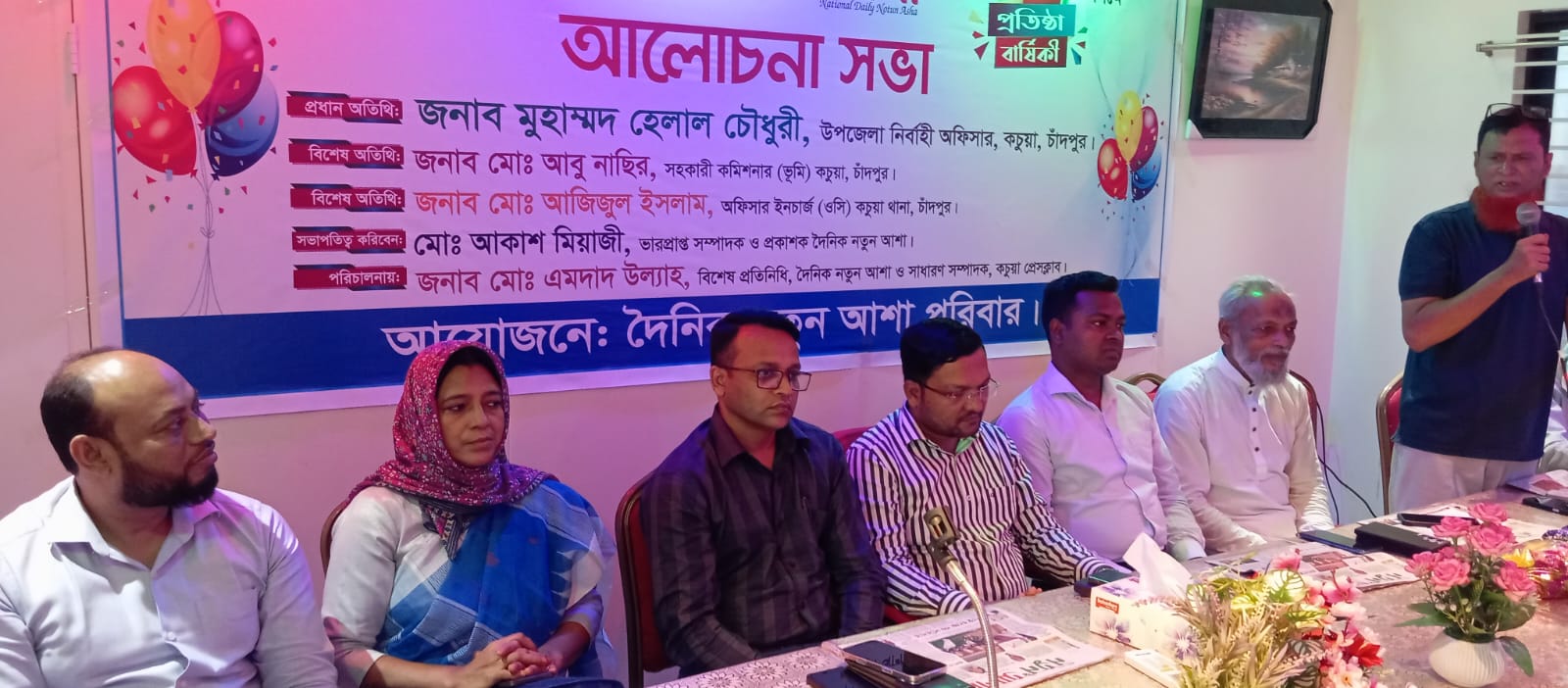 প্রতিষ্ঠা বার্ষিকী উপলক্ষে কচুয়া উপজেলা দৈনিক নতুন আশা পত্রিকার ভারপ্রাপ্ত সম্পাদক ও প্রকাশক মোঃ আকাশ মিঁয়াজীর আয়োজনে সোমবার বিকাল ০৩টায় কচুয়া বিশ্বর রোড তৃপ্তি হোটেলে সংক্ষিপ্ত আলোচনা সভা অনুষ্ঠিত হয়।