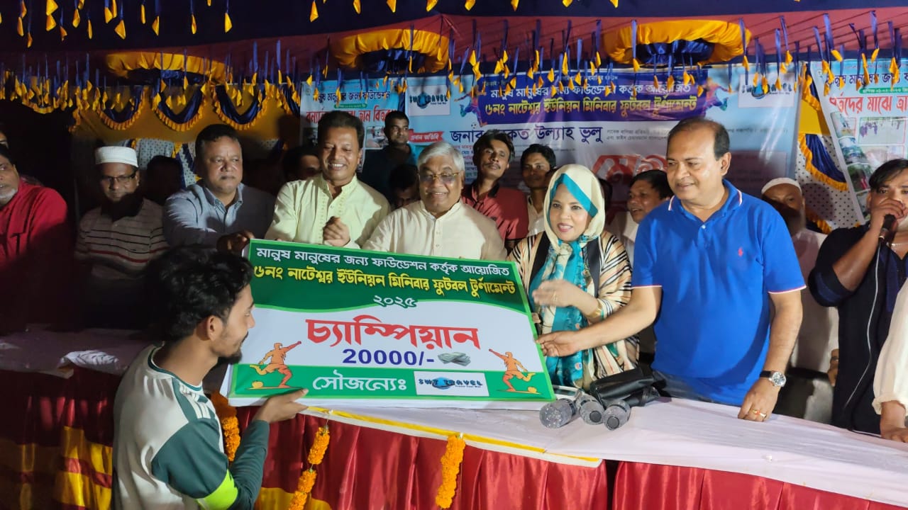 সোনাইমুড়ীর ‘মানুষ মানুষের জন্মনুষ মানুষের জন্য ফাউন্ডেশন কতৃক আয়োজিত ৬নং নাটেশ্বর ইউনিয়ন মিনিবার ফুটবল টুর্নামেন্ট মেগা ফাইনাল অনুষ্ঠিত হয়েছে। নোয়াখালীর সোনাইমুড়ী উপজেলার ৬নং নটেশ্বর ইউনিয়নের ঘোষকামতা সরকারি প্রাথমিক বিদ্যালয়ের মাঠে আয়োজিত ফাইনালে বিজয়ী দলের হাতে নগদ অর্থ ও ট্রফি তুলে দেয় অতিথিরা।