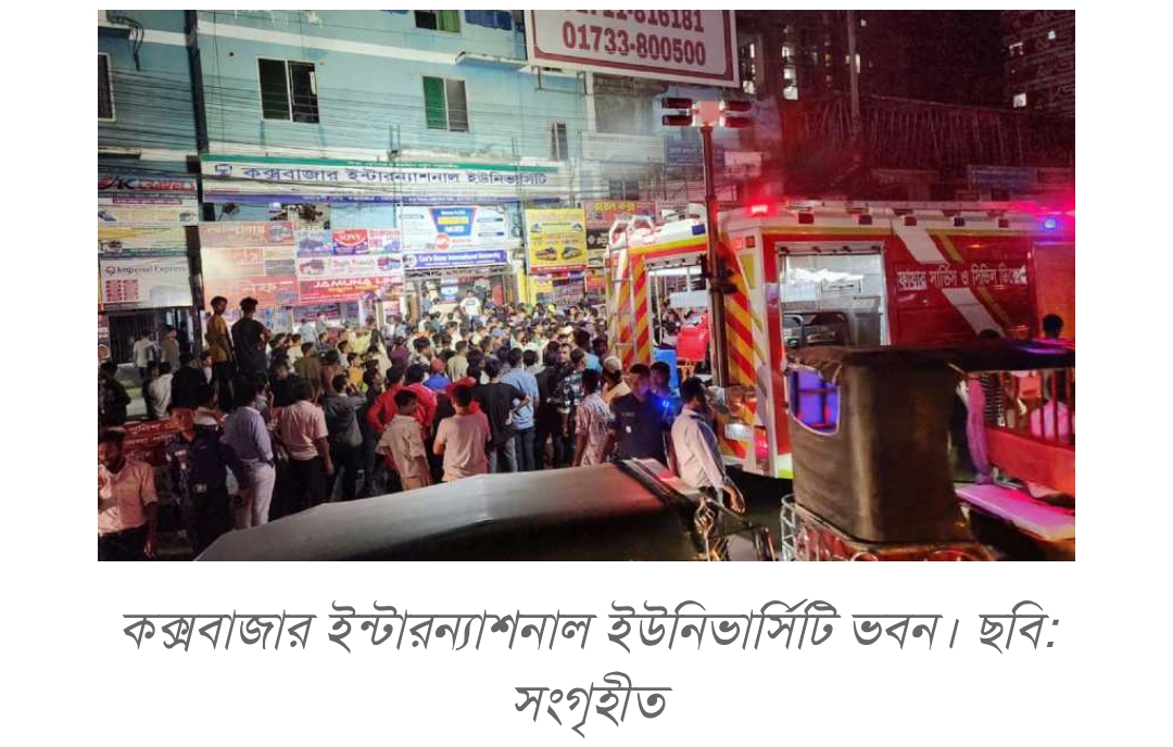 ফেসবুকে বিশ্ববিদ্যালয়ের সহকারী রেজিস্ট্রার (অ্যাডমিন) জাহাঙ্গীর সেলিম এক পোস্টে লেখেন, ‘কক্সবাজার ইন্টারন্যাশনাল ইউনিভার্সিটিতে আগুন ধরেছে। কাছে থাকলে চলে আসেন।’