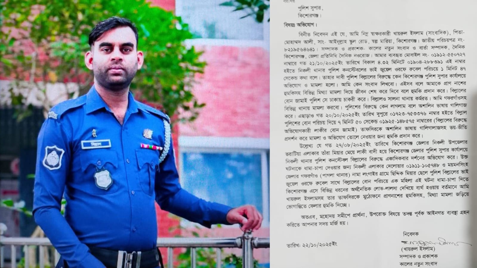 অভিযোগ সুএে জানাযায়, গত ২৭ আগষ্ট নিকলী থানার পুলিশ কনষ্টেবল বিল্লালের বিরুদ্ধ একাধিকবার ধর্ষনের অভিযোগ এনে কিশোরগঞ্জ পুলিশ সুপার বরাবর লিখিত অভিযোগ দায়ের করেন এক তরুনী। এ বিষয়ে সংবাদ প্রকাশের জন্য অভিযুক্ত বিল্লালের বক্তব্য নেয়ায় ক্ষিপ্ত হয়ে বিল্লালের জুয়েল ওরফে রুবেল পুলিশ পরিচয় দিয়ে মুঠোফোনে প্রাণ- নাশের হুমকিসহ বিভিন্ন থানায় মিথ্যা বানোয়াট মামলা দিয়ে হয়রানি করবে।