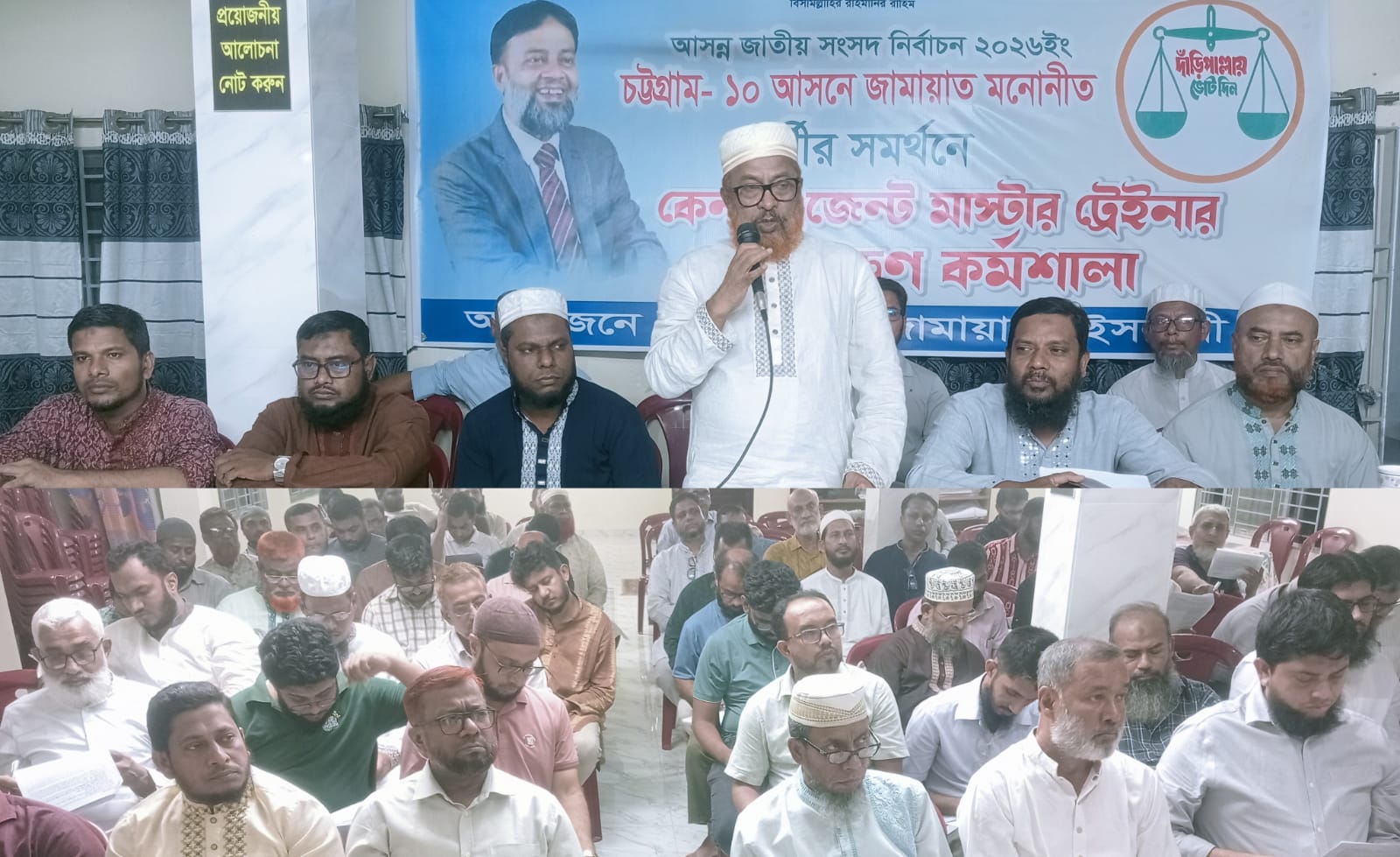বাংলাদেশ জামায়াতে ইসলামী মনোনীত চট্টগ্রাম-১০ আসনের সংসদ সদস্য প্রার্থী অধ্যক্ষ শামসুজ্জামান হেলালীর সমর্থনে কেন্দ্র এজেন্ট মাস্টার ট্রেইনার প্রশিক্ষণ কর্মশালা সফলভাবে সম্পন্ন হয়েছে। ২৯ অক্টোবর(বুধবার) বিকেলে ঈদগাঁও বউবাজারস্থ পাহাড়তলী আইডিয়াল একাডেমিতে এ কর্মশালা অনুষ্ঠিত হয়।