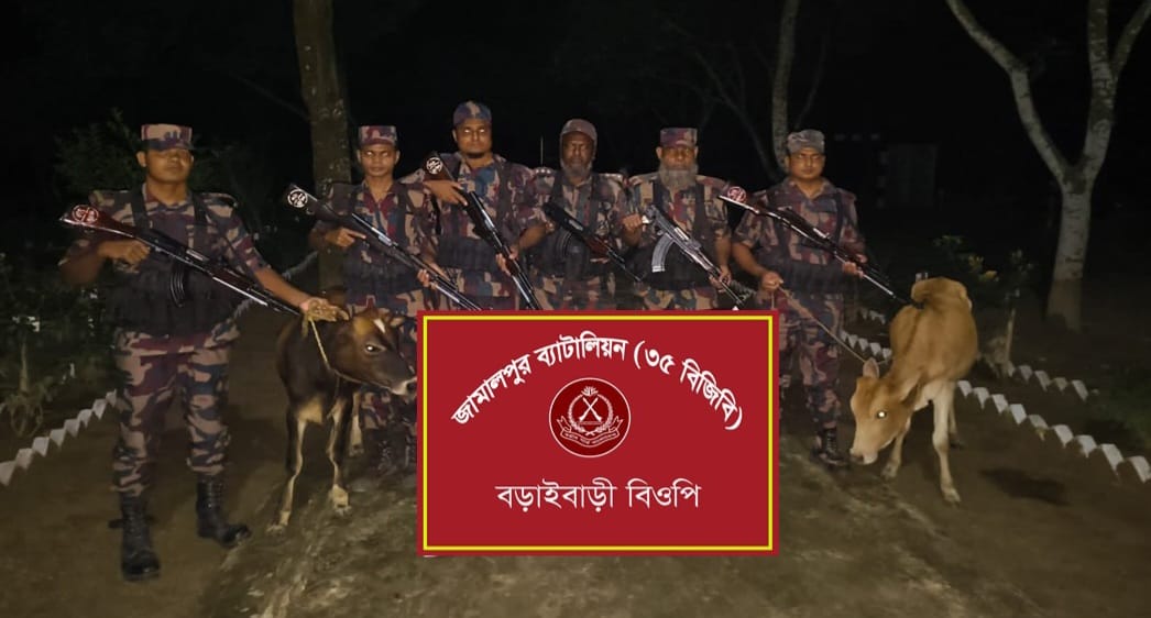 বিজিবি সূত্রে জানা গেছে, সোমবার ০৩ নভেম্বর আনুমানিক দুপুর ০২:৩০ ঘটিকায় নিজস্ব গোয়েন্দা তথ্যের ভিত্তিতে জামালপুর ব্যাটালিয়নের (৩৫ বিজিবি) অধিনস্থ বড়াইবাড়ী বিওপি কর্তৃক চোরাচালান বিরোধী অভিযান পরিচালনাকালে সীমান্ত পিলার ১০৬৯/এমপি হতে আনুমানিক ২.৫ কিঃ মিঃ বাংলাদেশের অভ্যন্তরে চর লালকুড়া নামক স্থান হতে ভারতীয় গরু-০২টি আটক করতে সক্ষম হয়। জব্দকৃত ভারতীয় গরু রৌমারী কাষ্টমস এ জমা করার কার্যক্রম প্রক্রিয়াধীন।