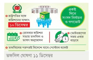 আগামী ত্রয়োদশ জাতীয় সংসদ নির্বাচন ও গণভোটের তফসিল ১১ ডিসেম্বর ঘোষণা করা হবে। ওইদিন জাতির উদ্দেশে ভাষণের মধ্য দিয়ে প্রধান নির্বাচন কমিশনার এ এম এম