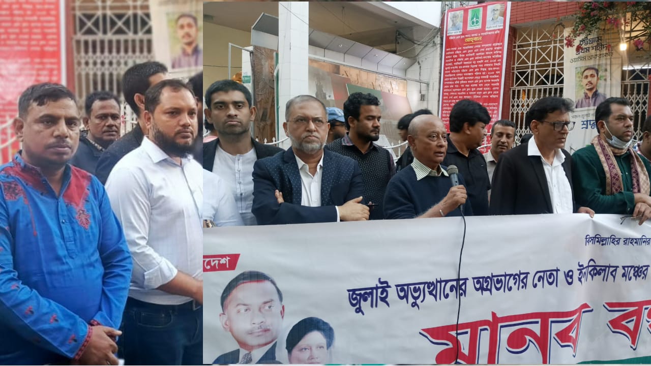 বিশেষ অতিথির বক্তব্যে চট্টগ্রাম মেট্রোপলিটন সাংবাদিক ইউনিয়ন (সিএমইউজে) এর সভাপতি মো. শাহনেওয়াজ। তিনি বলেন, বাংলাদেশ একটি অন্ধকার সময় পার করছে। ওসমান হাদির ওপর হামলা কোনো বিচ্ছিন্ন ঘটনা নয়; এটি দেশের স্বাধীনতা, সার্বভৌমত্ব, গণতন্ত্র ও আসন্ন নির্বাচনকে ঘিরে চলমান ষড়যন্ত্রের অংশ। তিনি স্মরণ করিয়ে দেন, এর আগেও গোলাপগঞ্জসহ বিভিন্ন স্থানে জুলাই যোদ্ধাদের ওপর হামলা হয়েছে, এমনকি সচিবালয়েও তারা আক্রান্ত হয়েছেন। কিন্তু এসব ঘটনায় সরকার কার্যকর বিচার নিশ্চিত করতে পারেনি।