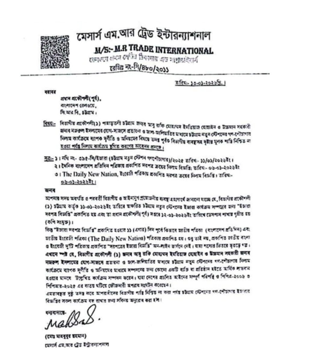 চট্টগ্রাম নতুন স্টেশনের গণশৌচাগারের ইজারা দরপত্র বিজ্ঞপ্তি নিয়ে গুরুতর অনিয়মের অভিযোগ উঠেছে। এ বিষয়ে বাংলাদেশ রেলওয়ের প্রধান প্রকৌশলী (পূর্ব) বরাবর লিখিত অভিযোগ দিয়েছেন এক ঠিকাদার। অভিযোগে বলা হয়েছে, রেলওয়ের চট্টগ্রাম বিভাগীয় প্রকৌশলী আবু রাফি মোহাম্মদ ইমতিয়াজ হোছাইন ও উচ্চমান সহকারী নজরুল ইসলামের যোগসাজশে প্রতারণা ও জালিয়াতির মাধ্যমে এই ইজারা কার্যক্রম পরিচালিত হচ্ছে।